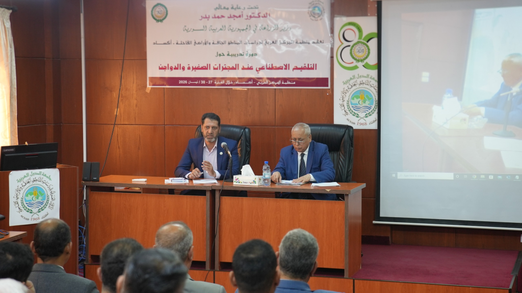 انطلقت في مقر منظمة المركز العربي لدراسات المناطق الجافة والأراضي القاحلة “أكساد” دورة تدريبية متخصصة بعنوان “التلقيح الاصطناعي عند المجترات الصغيرة والدواجن”، والتي ينظمها بالتعاون مع وزارة الزراعة ونقابة الأطباء البيطريين في سورية، لصالح 16 متدرباً من نقابة الأطباء البيطريين، وذلك خلال الفترة من 27 إلى 30 نيسان 2026.
